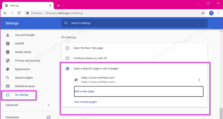 - Click on Add a new page and enter the URL address you want to open automatically.
