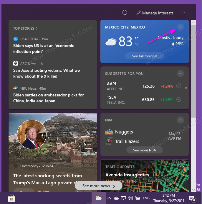 - Find the weather card in the upper right corner, and then click on the button with three dots.