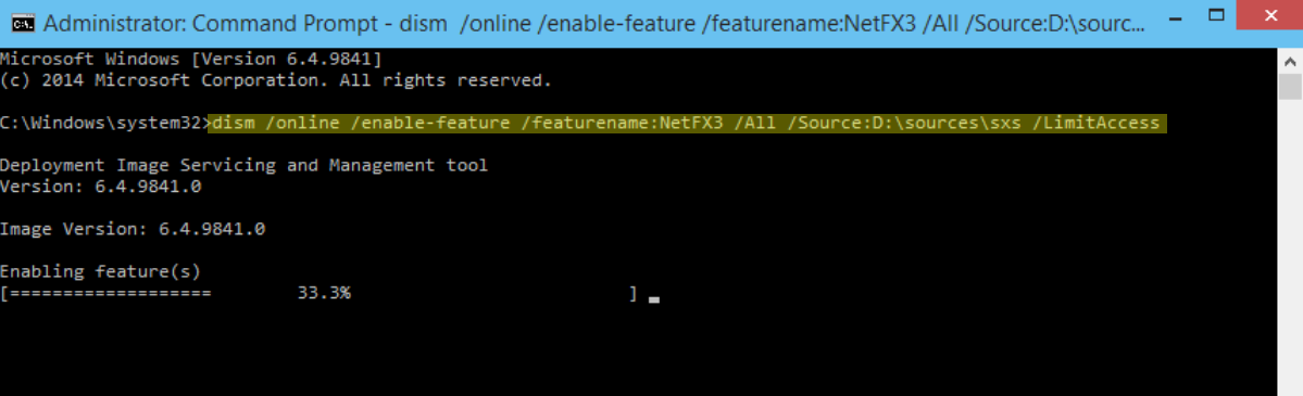 Dism /online /enable-feature /featurename:NetFX3 /All /Source:D:\sources\sxs /LimitAccess